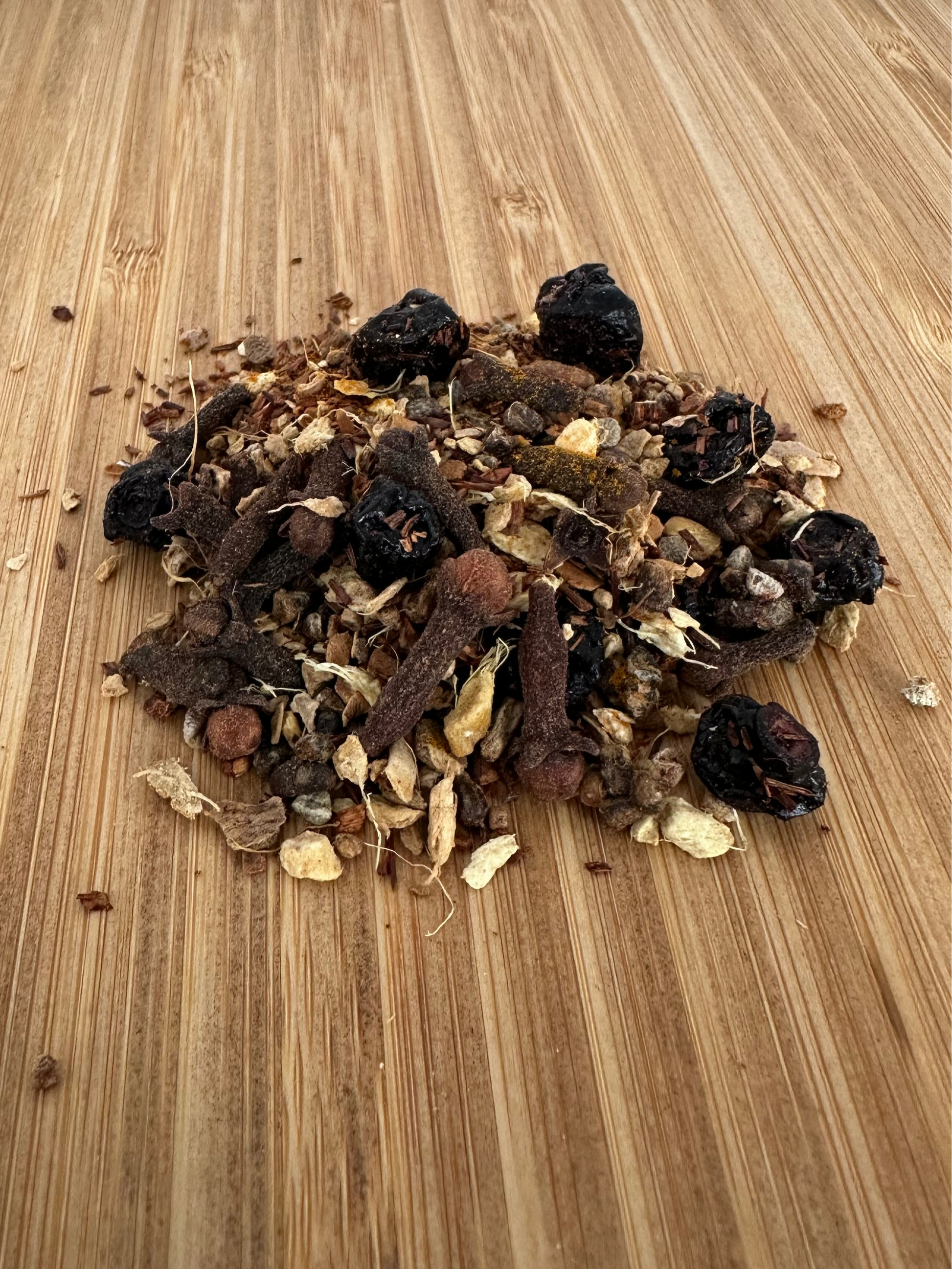 Minnesota Chai ingredients: Rooibos, Cloves, Ginger root, Cardamon seed, Cinnamon granules, Maple sugar, Blueberries, & Turmeric