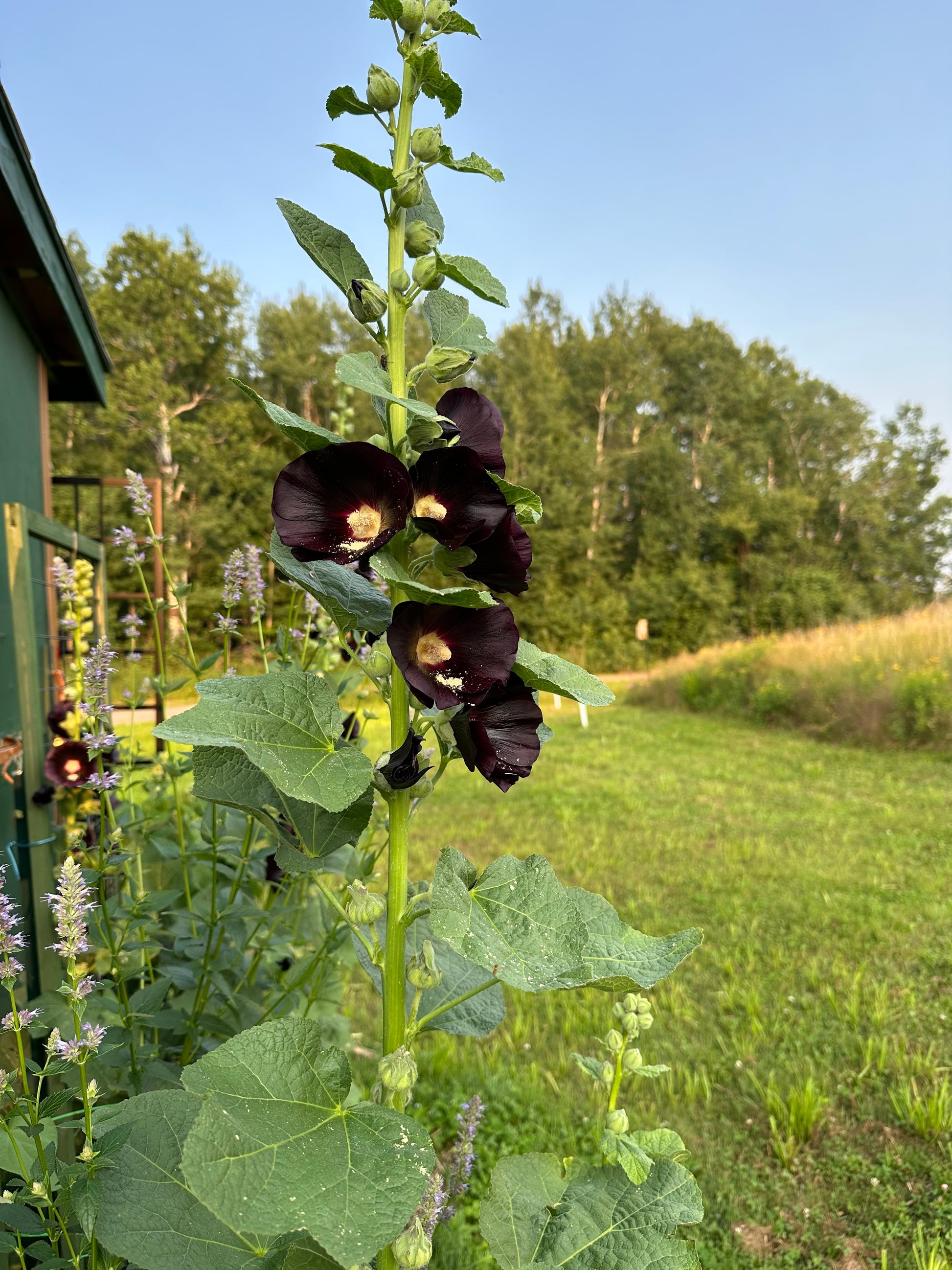 Hollyhocks are typically biennial plants, meaning they spend the first year growing foliage and storing energy, & bloom in their second year. They can grow 5 to 8 feet tall, producing large, showy flowers. I encourage you to let the seed pods stay all fall and winter. Critters will eat the seeds and some will fall to the ground and surprise you the next season with even MORE Hollyhocks!